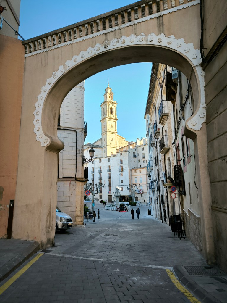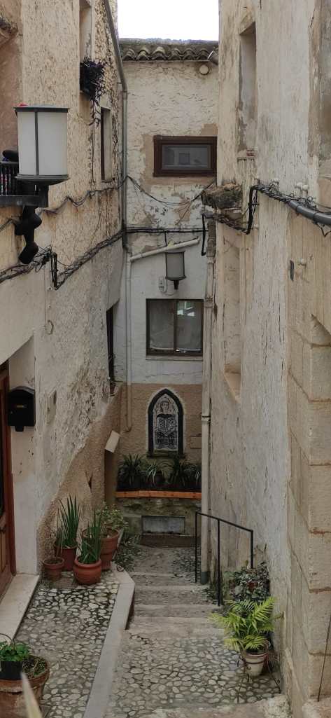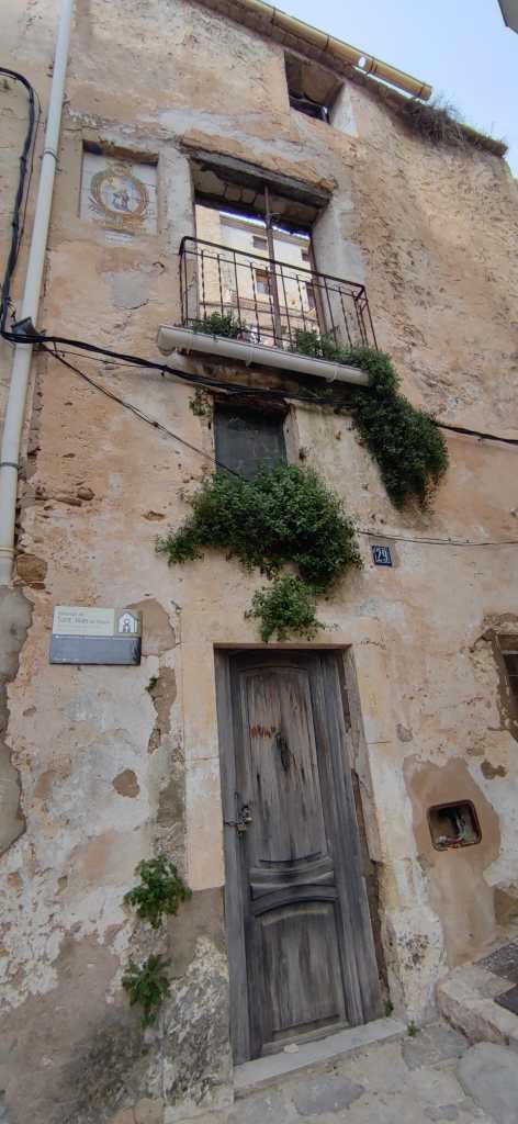 Llegamos al Portal de Sant Josep y vemos una de las hojas de la antigua puerta y el antiguo escudo de la vila. Encima de la puerta está el balcón que pertenecía a las dependencias del cuerpo de guardia.
