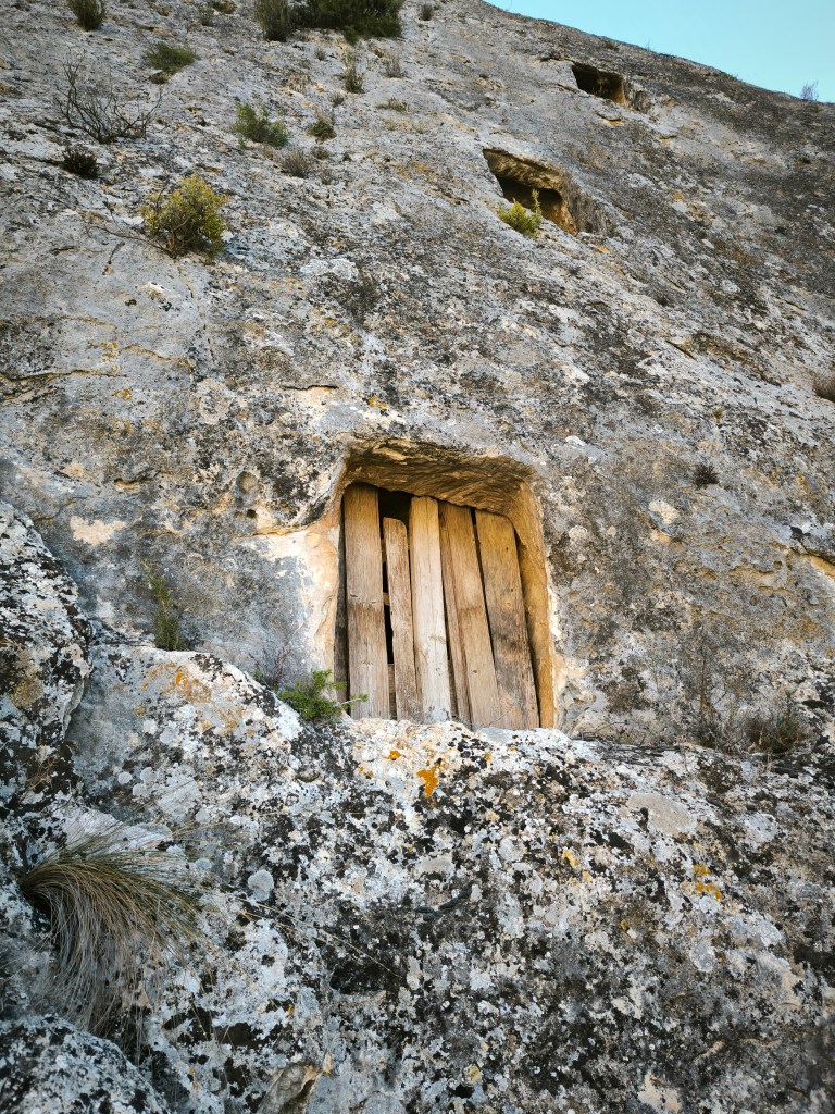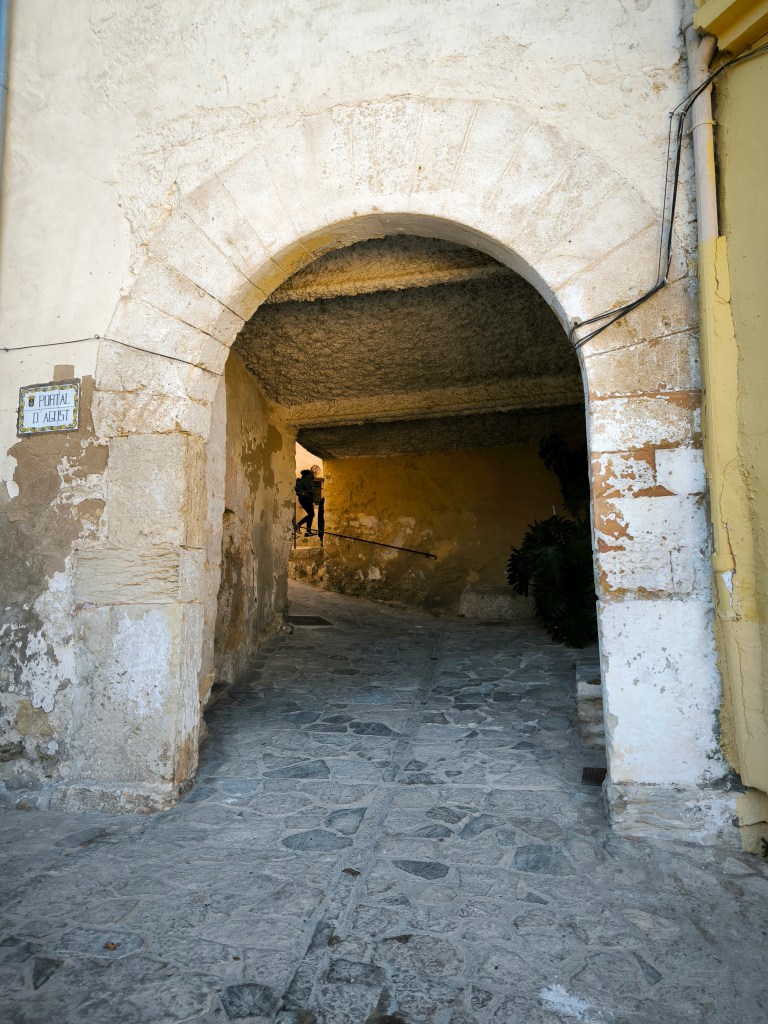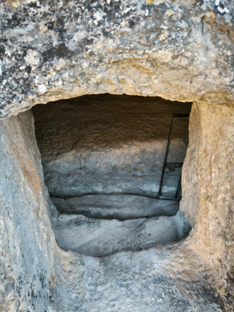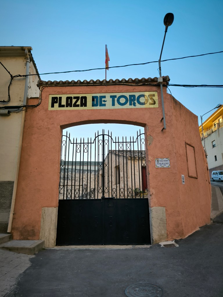 Antes de atravesar la roca que nos da paso, vemos una cruz de piedra a la izquierda. Esta zona coincide con el trinquet, zona de juego de pelota valenciana hasta el siglo pasado y anteriormente cementerio musulmán.
