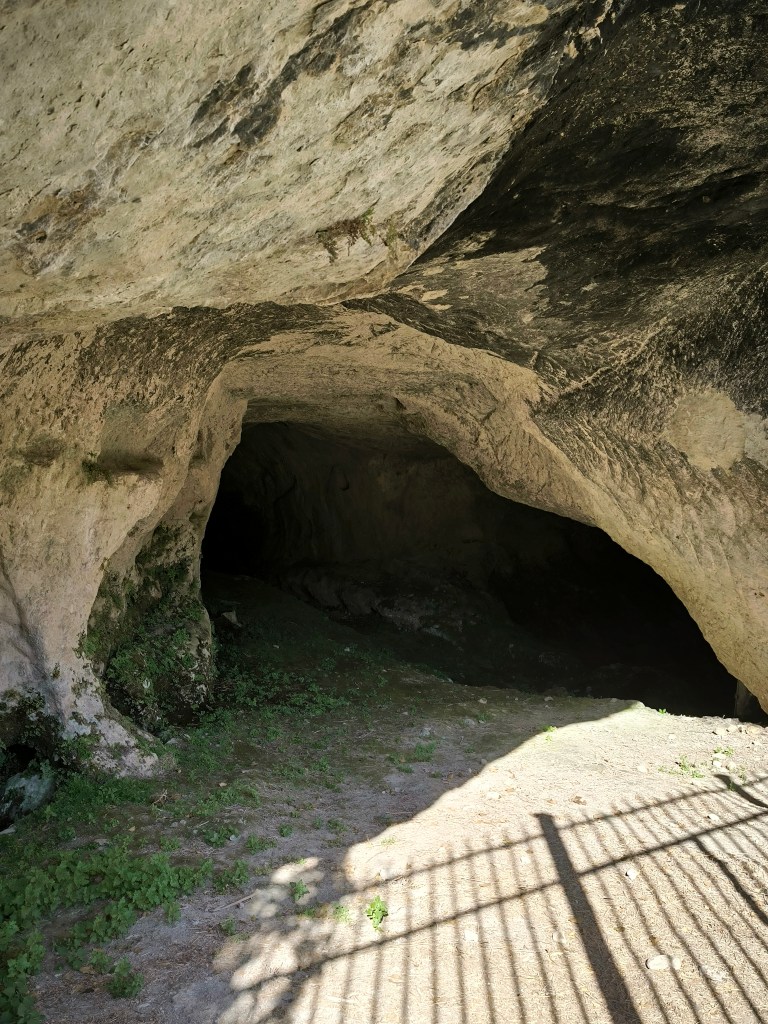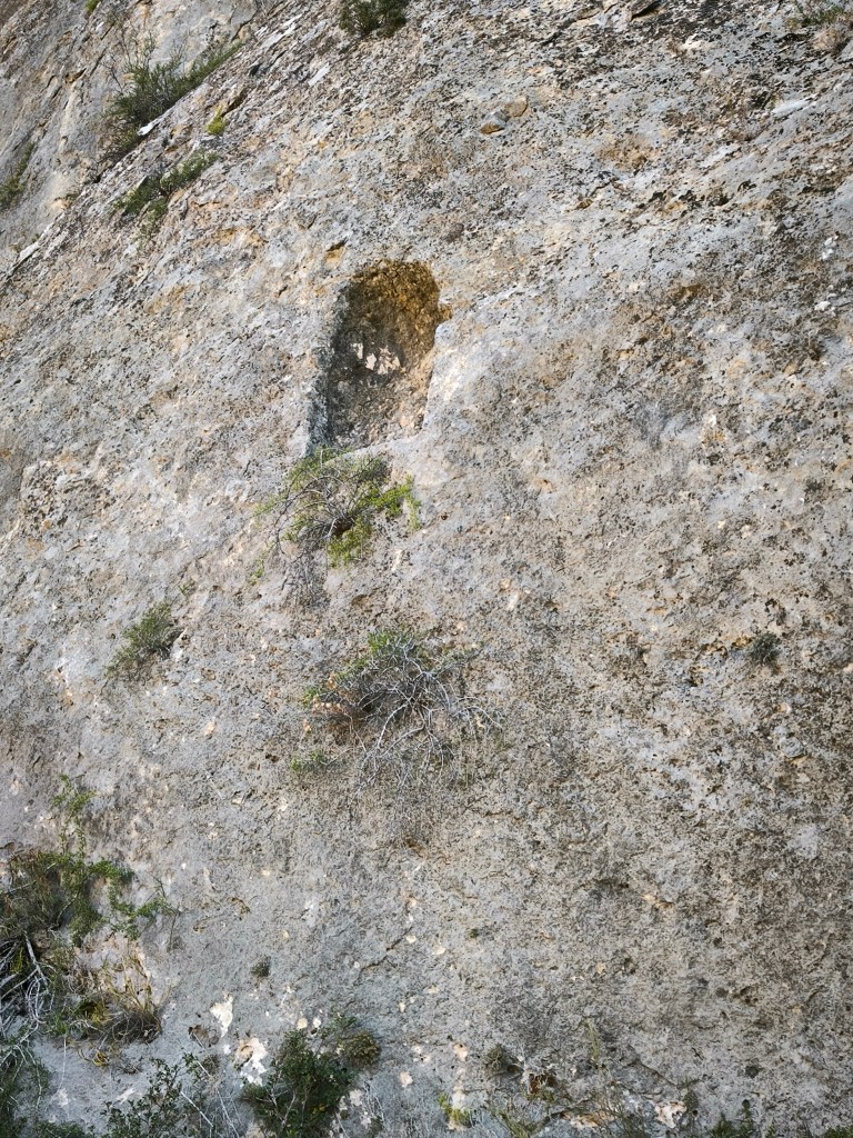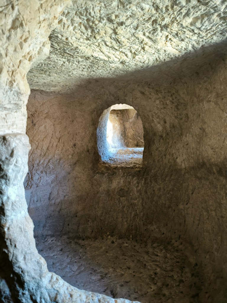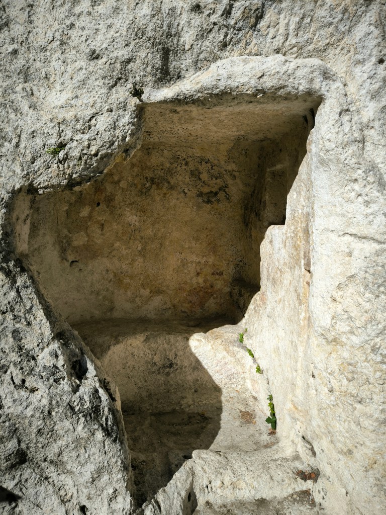 Antes de atravesar la roca que nos da paso, vemos una cruz de piedra a la izquierda. Esta zona coincide con el trinquet, zona de juego de pelota valenciana hasta el siglo pasado y anteriormente cementerio musulmán.